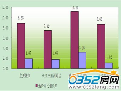 從環比增長率看,東部地區綜合地價增長率與全國平均水平持平,介于中部和西部地區重點城市平均水平之間,為1.98%,較上一季度下降了1.43個百分點;中部地區綜合地價增長率低于全國和東部、西部地區重點城市平均水平,為1.68%,較上一季度上升了0.54個百分點;西部地區綜合地價增長率高于全國和東、中部地區重點城市平均水平,為2.33%,較上一季度下降了0.19個百分點。
