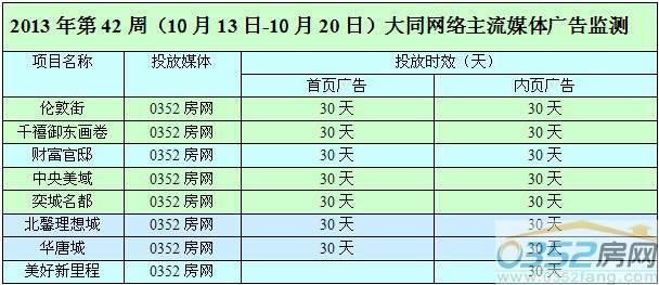 本期報告以2013年第42周(2013.10.14-2013.10.20)的廣告監測統計數據為基礎,對樓盤在各類媒體廣告的投放排名、投放總量、各區域樓盤廣告發布量排名、媒體分布等多方面進行圖表分析,由此,對正在力推的新樓盤、大同主要媒體在房地產行業的影響度、消費者的媒體偏好等進行歸納,以求為業內外關心房地產發展的各界人士提供更真實可靠的行業動態走勢參考。