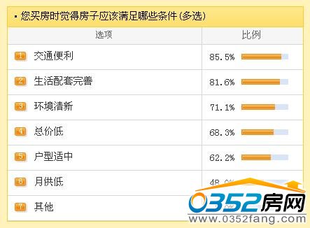 近日,0352房網在網站中,對你覺得買房子因該滿足那些條件進行了問卷調查。其中涉及到交通,生活配套,環境清晰度,價格,戶型,月供等七項主要購房指標。