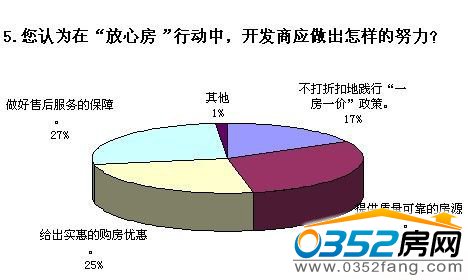 對于購房者來說,房源的質量是關乎其以后數十年使用的“終身大事”,而為購房者把守“質量關”的首先就是開發商。在“您認為在‘放心房’行動中,開發商應做出怎樣的努力”的調查中,30%的受訪者將選票投給了“提供質量可靠的房源”,其后則為“售后服務的保障”和“給出實惠的購房優惠”,兩項占比分別為27%和25%。