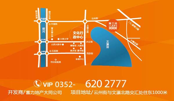 大同富力城處于大同市行政、商業和居住中心區域,距大同的體育中心、文化中心、會展中心、行政中心以及大同大學僅一步之遙,項目東依得大高速,西鄰文瀛湖,北靠云州街,山水相依,自然條件優越,距離大同市核心區6公里,是未來新城建設的重點區域,項目建設主要為居住、酒店、商業、辦公樓、綜合樓等,是大同市目前為止最大綜合性樓盤。項目最高層分為25層、32層兩種類別。