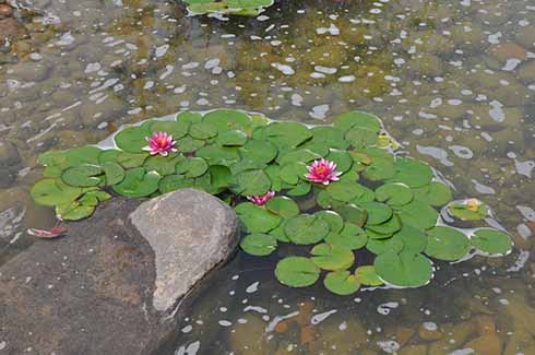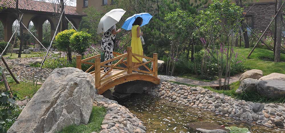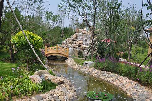 沉浸在百花香,耳邊不時(shí)傳來(lái)叮咚的流水之音。隨聲一路尋來(lái),展現(xiàn)在眼前的是一副別致的山水美景圖。迎面而來(lái)的涼爽頓時(shí)讓人心曠神怡。清水順著山石緩緩流淌,尋不見(jiàn)盡頭。更有一朵朵盛開(kāi)的荷花為這流動(dòng)的景色點(diǎn)綴一抹亮色。小巧的木質(zhì)拱橋依河而搭,顯得自然而不突兀。更有人在橋上走,情隨河水流的境界。