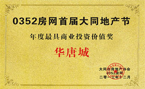 華唐城在0352房網舉辦首屆大同地產節上獲2013年度最具商業投資價值獎,這是數萬網友共同選出的結果,這也證明華唐城本身兼具這個實力,得此殊榮是實至名歸。