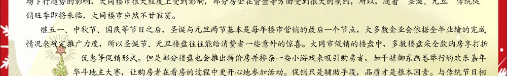 年底開發(fā)商的促銷活動(dòng)精彩紛呈,雖然頂著回款的壓力,但是依舊想盡各種辦法吸引購房者買房。而且繼五一、國(guó)慶等假期后,圣誕、元旦雙節(jié)到來,開發(fā)商促銷力度有增無減,爭(zhēng)取能在年底之前將待售的房屋盡量多的推銷出去。在這個(gè)時(shí)候,對(duì)于準(zhǔn)備置業(yè)的購房者來說是個(gè)置業(yè)的好時(shí)機(jī),新房的優(yōu)勢(shì)不言而喻,可以以實(shí)惠的價(jià)格買到滿意的戶型,準(zhǔn)備置業(yè)的購房者不妨把握一下吧!