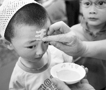 端午飲雄黃酒的習俗,在長江流域地區極為盛行。古在沒有碘酒之類消毒劑的古代,用雄黃泡酒,可以祛毒解癢。未到喝酒年齡的小孩子,大人則給他們的額頭、耳鼻、手足心等處涂抹上雄黃酒,意在消毒防病,蟲豸不!