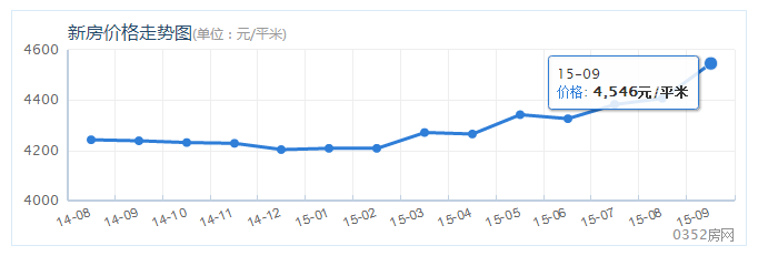 據大同0352房網網站有關大同在售新房均價走勢參考顯示,目前大同在售樓盤,2015年9月統計大同樓盤均價4336元/平米,8月份統計大同樓盤均價同為4268元/平米.房價在2015年8月和9月相比,9月出現上漲趨勢,漲幅略高。