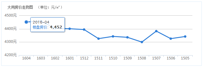 據大同0352房網網站有關大同在售新房均價走勢參考顯示,目前大同在售樓盤,2016年4月統計大同樓盤均價4452元/平米,2016年3月份統計大同樓盤均價同為4459元/平米。房價在2016年4月和2016年3月相比,房價基本持平,4月份房價每平米小幅下降7元。