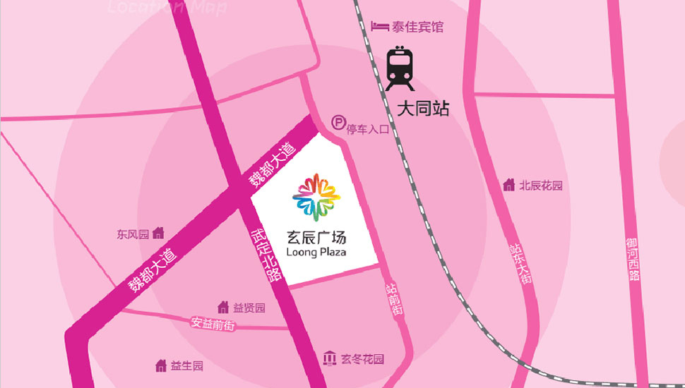 玄辰廣場落址于魏都大道與武定北路交界處,地理位置得天獨厚,兩條城市主干道直達項目,西側、北側擁有絕佳的商業展示面。項目周邊公共交通路網發達,擁有11條公交線路,公交站點幾乎覆蓋全部大同區域,無論自駕還是公交,到達玄辰廣場都非常方便。