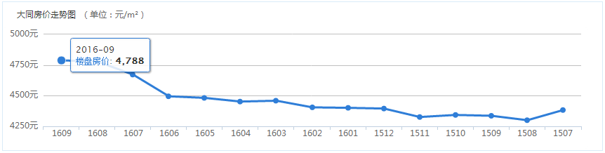 從2016年房價整體走勢來看,2016年1月-9月,大同房屋均價整體呈上漲趨勢,上漲幅度略有不 同。從房價走勢圖來看,前6個月房價呈波動上漲,增長幅度不是很大,基本維持在4400元/㎡-4500元/㎡ 之間。然而,從7月份開始,大同房價出現(xiàn)大幅增長。數(shù)據(jù)顯示,7月份大同房屋均價增長率為3.9%,環(huán)比 上漲幅度最大。8月份增長率為2.3%,環(huán)比漲幅有所降低。9月份增長率為0.19%,房價漲幅逐漸縮小。