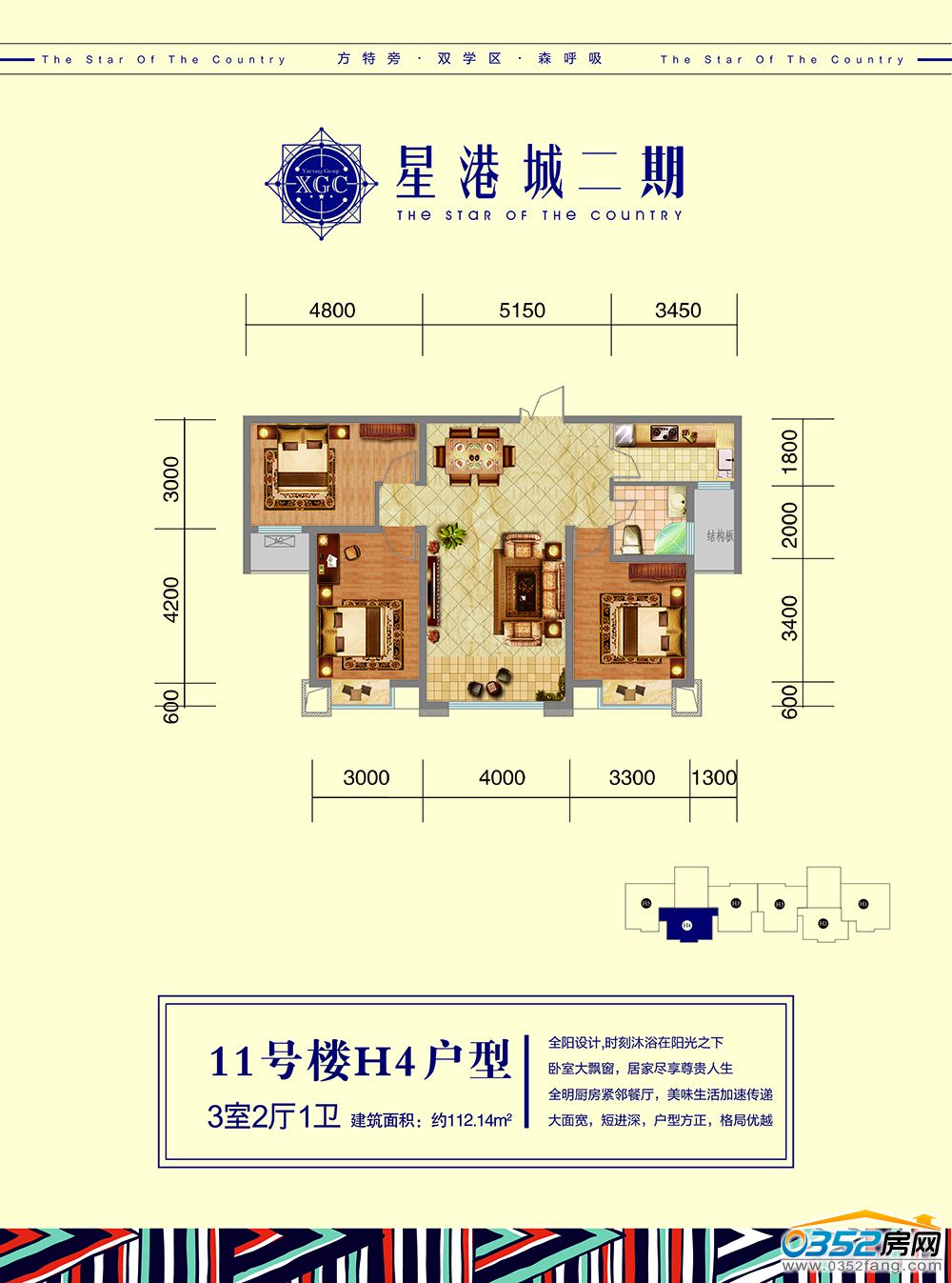 星港城二期位于一期項目的南面,項目共建7棟樓,整體綠化率高達65%,致力于打造健康社區、純居社區,生態社區,倡導綠色生活,健康生活。在戶型設計方面,以實用性為出發點,人性化的設計理念,知名設計師結合大同人生活動線,打造本土化戶型,90-150㎡戶型面積區間,滿足購房者的不同居住需求。