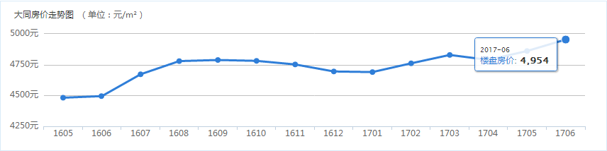 環(huán)比2017年5月份,大同6月在售商品房均價(jià)每平米上漲93元,環(huán)比上漲1.9%。同比來(lái)看,2016年6月份大同在售商品房均價(jià)為4495元/㎡,2017年6月大同在售商品房均價(jià)大幅上漲,每平米上漲459元,同比增長(zhǎng)10.2%。