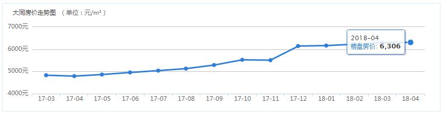 據0352房網數據中心有關大同在售商品房均價走勢參考顯示,通過對目前大同在售樓盤價格的統計,2018年3月份統計大同樓盤均價為6297元/㎡,2018年4月份統計大同樓盤均價為6306元/㎡。和上個月相比,4月房價也是出現小幅上漲,每平米上漲9元。