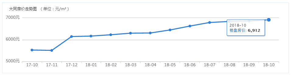 據0352房網數據中心有關大同在售商品房均價走勢參考顯示,通過對目前大同在售樓盤價格的統計,2018年10月份統計大同樓盤均價為6912元/㎡,2018年9月份統計大同樓盤均價為6852元/㎡。相比9月份,10月大同在售商品房價格略有上漲,每平米上漲60元。